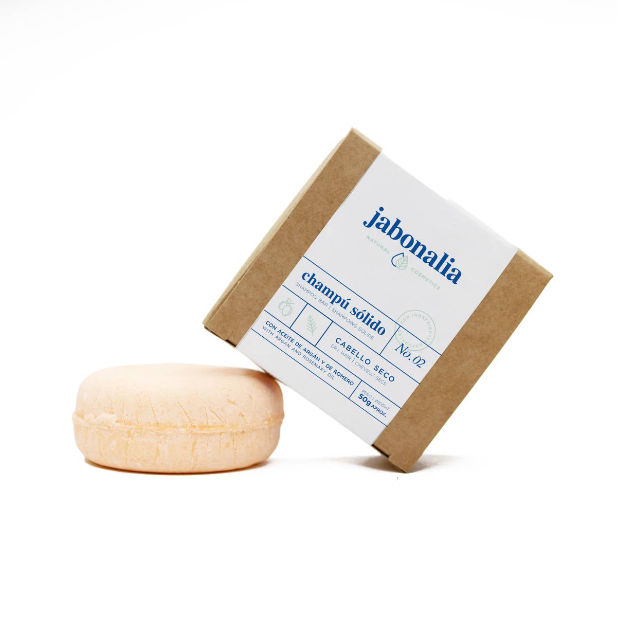 El champú sólido natural para cabello seco Jabonalia ha sido formulado con ingredientes naturales como el Aceite de Argán y aceite de Romero que proporcionan hidratación, fortalece el cabello y tiene propiedades antibacterianas y antifúngicas.
